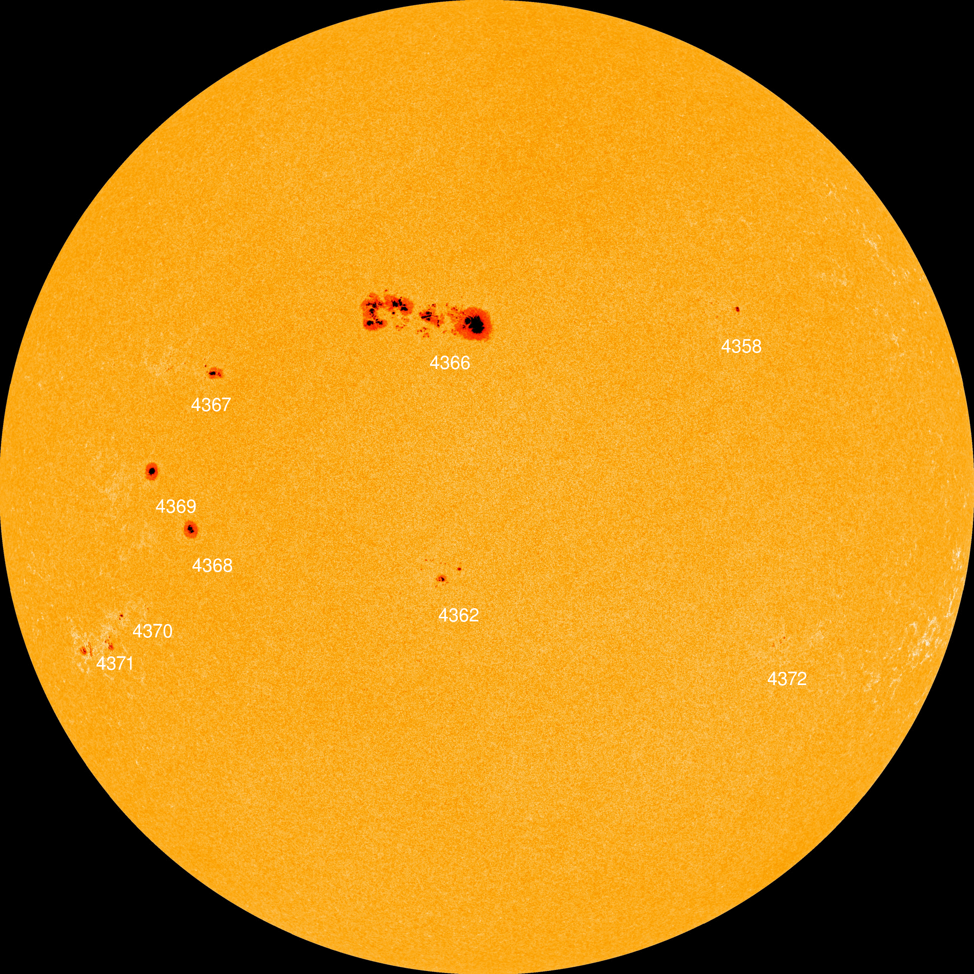 Below is a diagram of the sun with the sunspots labelled and an image of just AR4366. Both these images were taken from the website spaceweather.com.