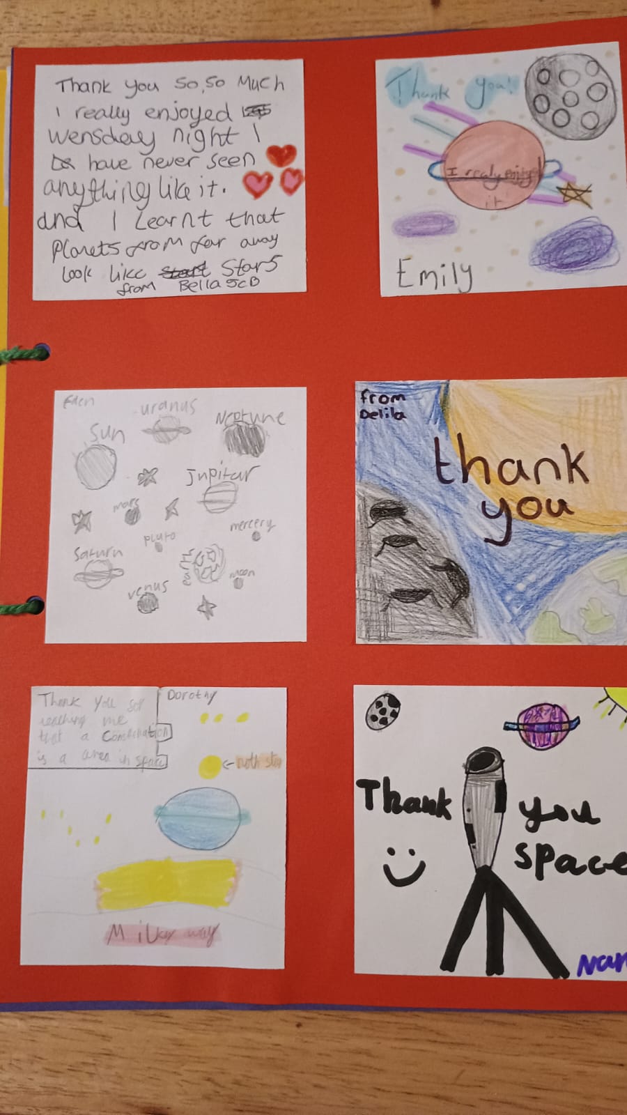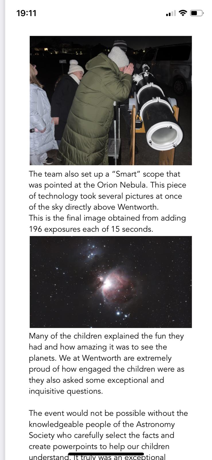 One involved a short talk on general astronomical topics with some visual aids. The second was a short slide show of images taken in the main by our members. The third in the gym involved everyone running around in circles to demonstrate the movements of all the planets in the solar system. The fourth was observing. We were lucky that in a week of bad weather we had a clear night. With six telescopes (2 reflectors, 2 refractors and 2 smart scopes) everyone saw the Moon, Jupiter, Saturn, the Orion nebula and the Andromeda galaxy. All of this was well received and fun for us, the teachers and the children.”