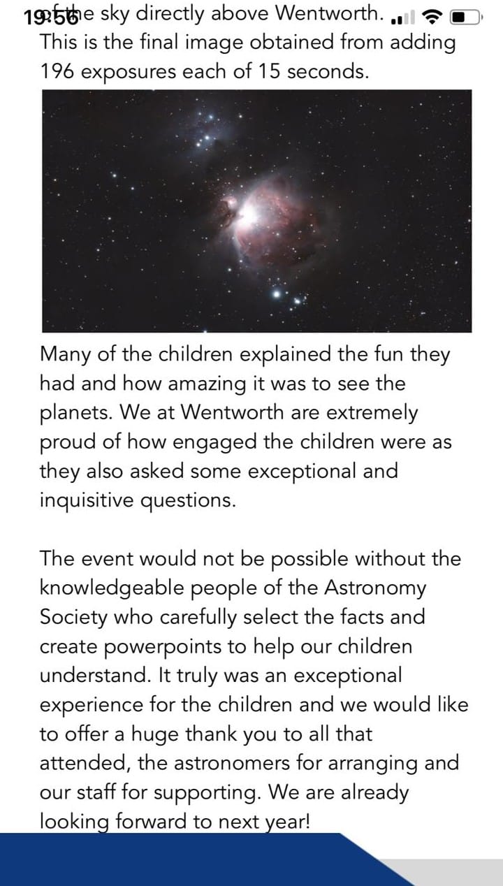 This is the final image of the Orion Nebula the children saw developing on a Dwarf3 smartscope by Dr. Mike Rushton. It is made up of a total of 196 images, each 15 seconds long in exposure.