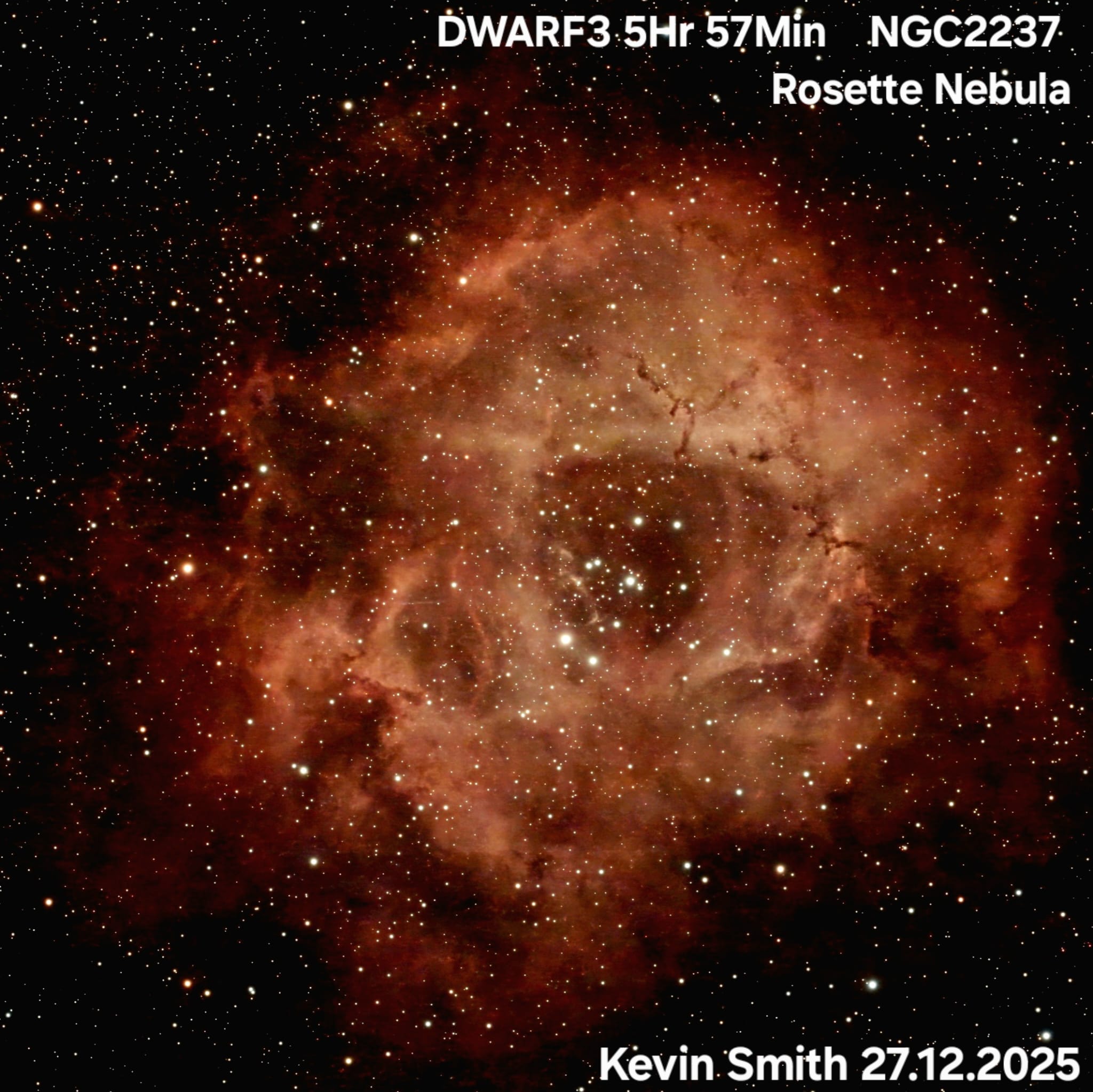 A stunning image of the Rosette Nebula taken by Kevin Smith on the 27th Dec 2025 using a Dwarf3 smartscope. The image is a total of 5 hours and 57 mins of exposure.
