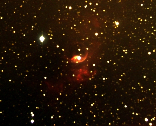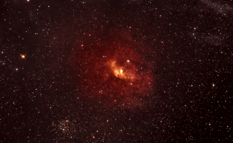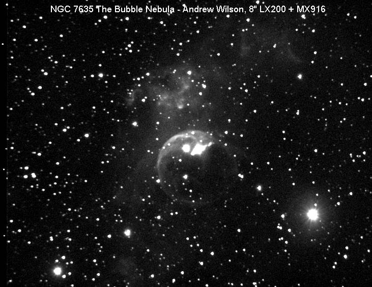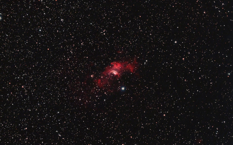 NGC 7635, also called the Bubble Nebula, is a H II region emission nebula in the constellation Cassiopeia . It lies close to the direction of the open cluster Messier 52. The “bubble” is created by the stellar wind from a massive hot, magnitude 8.7 young central star. The nebula is near a giant molecular cloud which contains the expansion of the bubble nebula while itself being excited by the hot central star, causing it to glow. It was discovered in 1787 by Friedrich Wilhelm Herschel. The star SAO 20575 or BD+602522 is thought to have a mass of 10-40 Solar masses.
