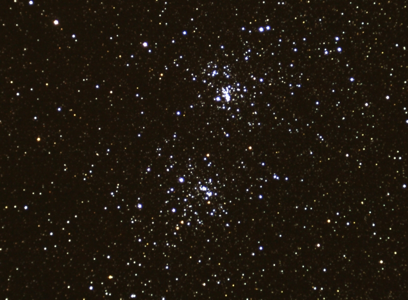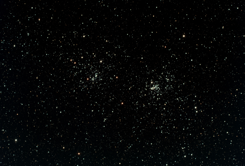 The Double Cluster is the common name for the naked-eye (OK you will need Binoculars in light polluted areas such as Crayford) open clusters NGC 884 and NGC 869, which are close together in the constellation Perseus. NGC 884 and NGC 869 are at distances of 7600 and 6800 light-years away, respectively, so they are close to one another in space as well.