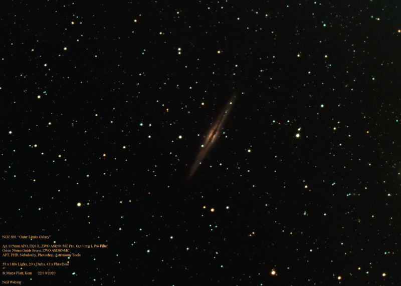 ”NGC 891 (also known as Caldwell 23, the Silver Sliver Galaxy, and the Outer Limits Galaxy) is an edge-on unbarred spiral galaxy about 30 million light-years away in the constellation Andromeda. It was discovered by William Herschel on October 6, 1784.” Ref:https://en.wikipedia.org/wiki/NGC_891