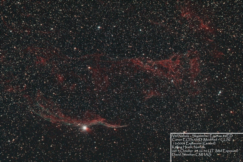 The Veil Nebula is a cloud of heated, ionized gas and dust in the constellation Cygnus. It constitutes the visible portions of the Cygnus Loop a supernova remnant. Sections of the Veil Nebula have their own individual names and catalogue identifiers and NGC6992 is a bright area in the Eastern Veil (also known as Caldwell 33) of the Veil Nebula.