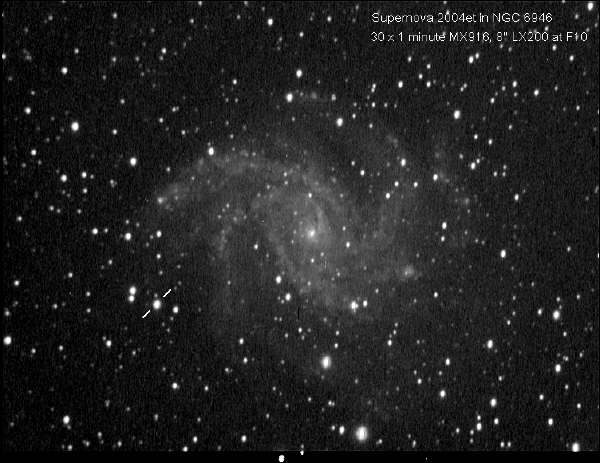 NGC 6946 is highly obscured by interstellar matter of the Milky Way galaxy, as it is quite close to the galactic plane. Nine supernovae (SN 1917A, SN 1939C, SN 1948B, SN 1968D, SN 1969P, SN 1980K, SN 2002hh, SN 2004et, and SN 2008S) have been observed in NGC 6946.