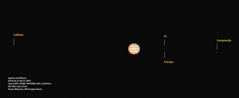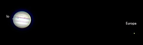 The second image, taken on the 30th at 05:00 MST (using a Canon 6D, ISO 500 and a 6 second exposure time) shows Venus & Jupiter appearing even closer together, in fact very close. The planets were separated by the same angular distance as a full moon: about 1/2 degree!!! Three moons of Jupiter; Ganymede, Io and Callisto can also be seen in the 2nd image.