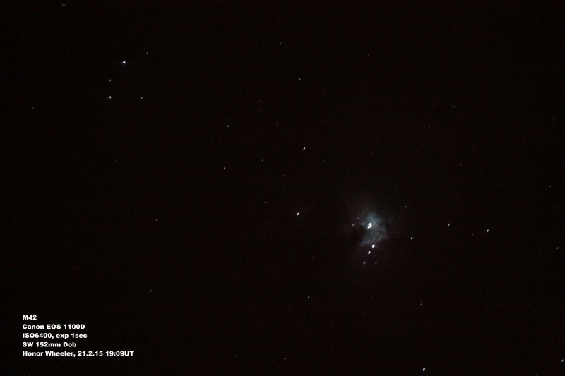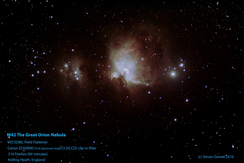 The Orion Nebula (also known as M42, or NGC 1976) is a diffuse nebula situated south of Orion’s Belt. It is one of the brightest nebulae, and is visible to the naked eye in the night sky – even on a good evening in Bexleyheath.