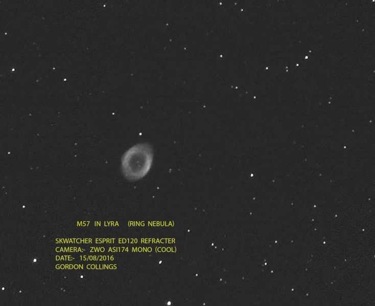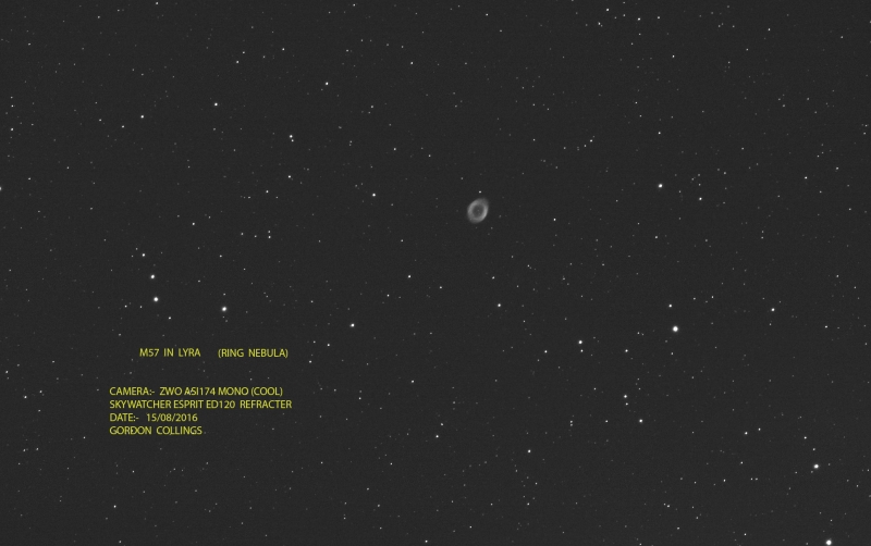 M57 The Ring Nebula.  Also catalogued as NGC 6720 is a planetary nebula in the northern constellation of Lyra.