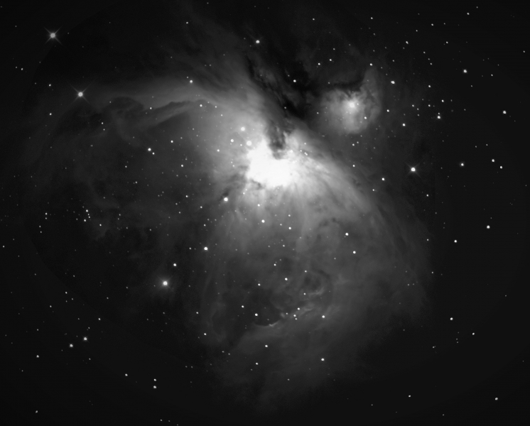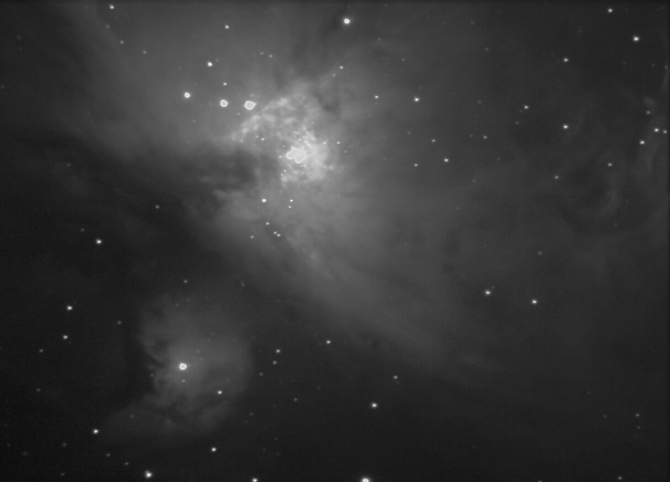 The Orion Nebula (also known as Messier 42, M42, or NGC 1976) is a diffuse nebula situated south of Orion’s belt in the constellation of Orion.  It is one of the brightest nebulae and is visible to the naked eye in the night sky with an apparent magnitude of 4.0. It is 1,344 ± 20 light-years (412.1 ± 6.1 pc) away and is the closest region of massive star formation to Earth. M42 is estimated to be 25 light-years across (so its apparent size from Earth is approximately 1 degree). It has a mass of about 2,000 times that of the Sun. Older texts frequently refer to the Orion Nebula as the Great Nebula in Orion or the Great Orion Nebula.” Ref:https://en.wikipedia.org/wiki/Orion_Nebula