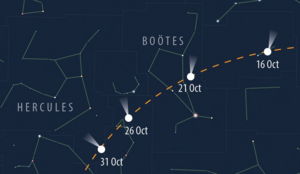 On the 24th Oct it will still be above Arcturus but near the star Izar. (Note: The handle of the Big Dipper points towards Arcturus.), and in the coming days it will move into the constellation Serpens.