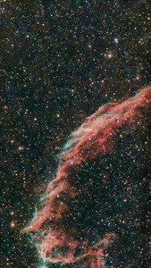 The Eastern Veil Nebula, also known as NGC 6992, is an expanding supernova remnant in the constellation Cygnus, bordering the constellation Vulpecula. It was formed by the explosion of a massive star 20 times more massive than the Sun that exploded approximately 8,000 to 10,000 years ago. It is composed of heated gas and dust and is part of a larger structure called the Cygnus Loop.