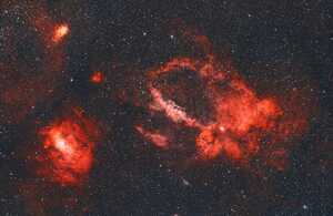 The Lobster Claw Nebula, also known as Sharpless 157 (Sh2-157), is an emission nebula located in the constellation Cassiopeia about 11,000 light-years from Earth. Its name comes from its distinct shape, which resembles a lobster’s claw and is formed by glowing gas, dark dust, and stars.