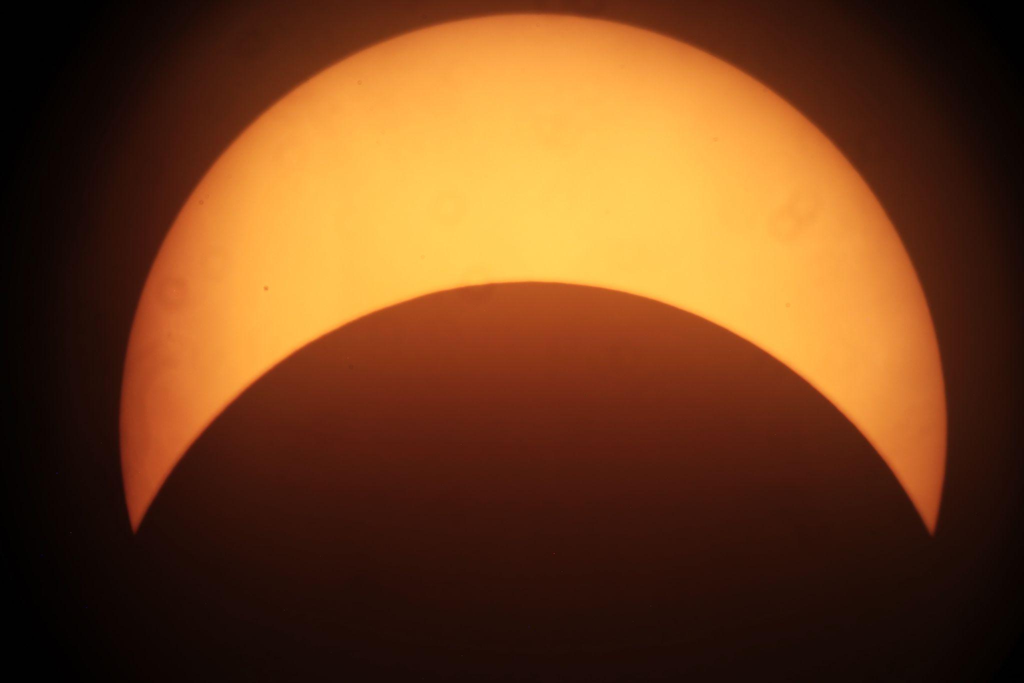 This eclipse was special for its colours around the horizon. There were wonderful oranges and reds all around, the clouds lit up, some dark in silhouette, some golden, glowing yellowy-orange in the distance. You could see the shadow approaching against the clouds and...